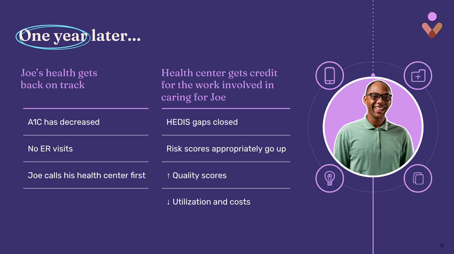 One year later, Joe’s health is back on track. His A1C has decreased and his overall health improved. He has had no ED visits because he calls his CHC first instead of heading straight to the hospital. And the health center gets credit for the work involved in caring for Joe: