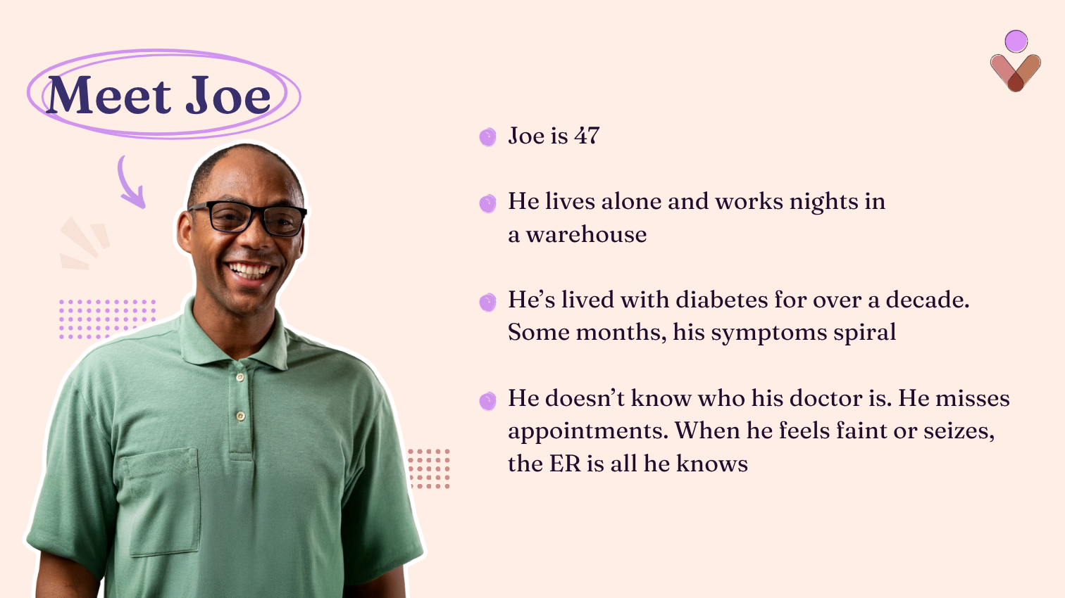 Take Joe (a hypothetical patient). He’s 47, lives alone, and struggles to manage his diabetes. Some months are tougher than others. When his blood sugar drops too low, Joe faints or has seizures, and his only option is to go to the Emergency Department (ED).
